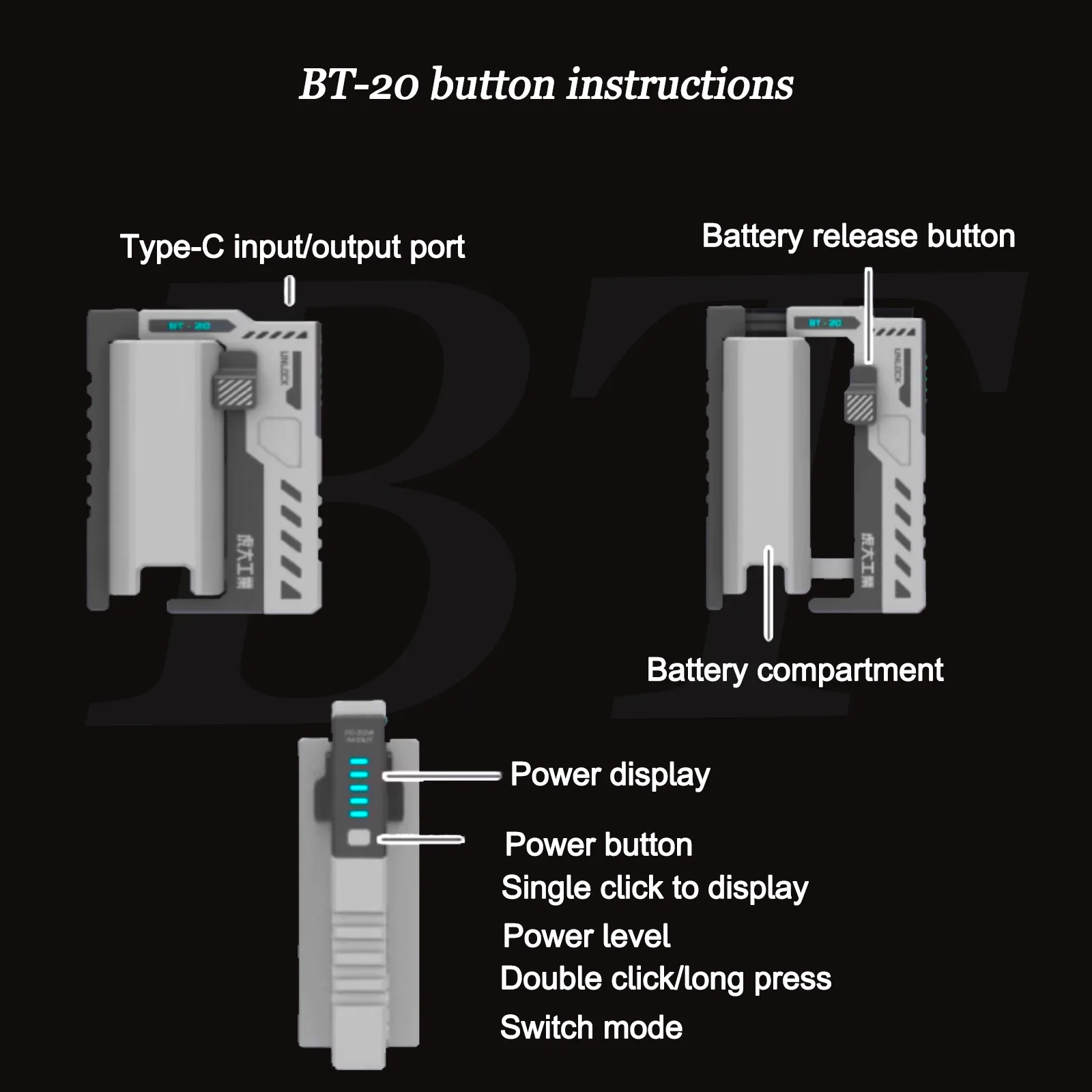 The BT – 20 is equipped with one Type – C input/output port. You need to manually place the self – prepared batteries into the battery compartment. Its mechanical structure has a smooth and symmetrical design, making it easy to operate with either one hand or two hands. It features reverse – connection and reverse – charge protection, as well as one – button quick battery replacement. The device automatically detects the battery power. After 5000 life – cycle tests, components like springs and clips show no significant wear (if used 2 times a day, it can last for 7 years; if used 5 times a day, it can last for 3 years).