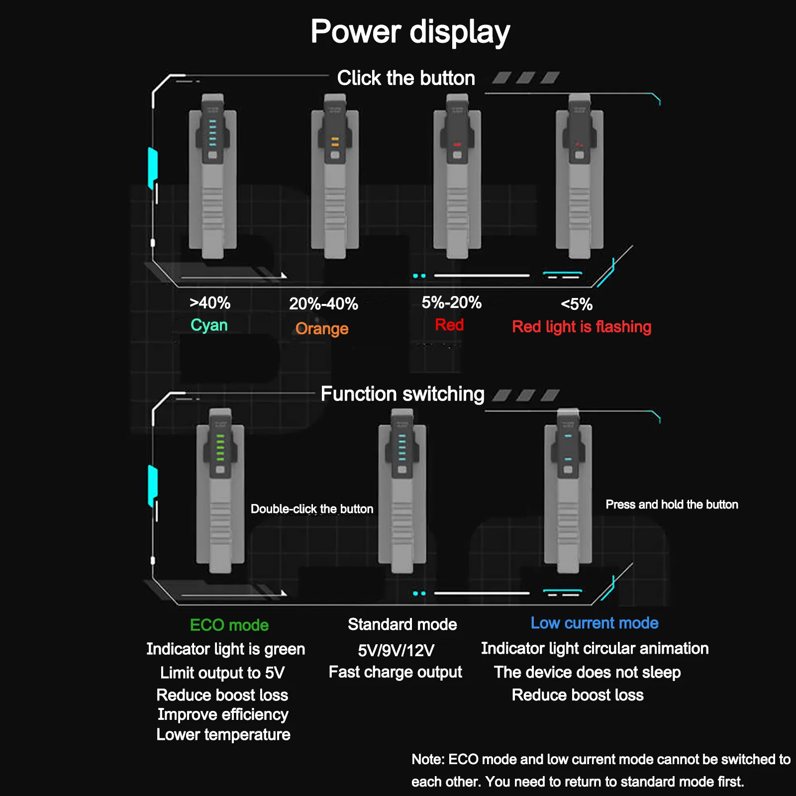 - ECO Mode: The green light indicates that the output is limited to 5V to reduce boost loss, increase efficiency, and lower the temperature.