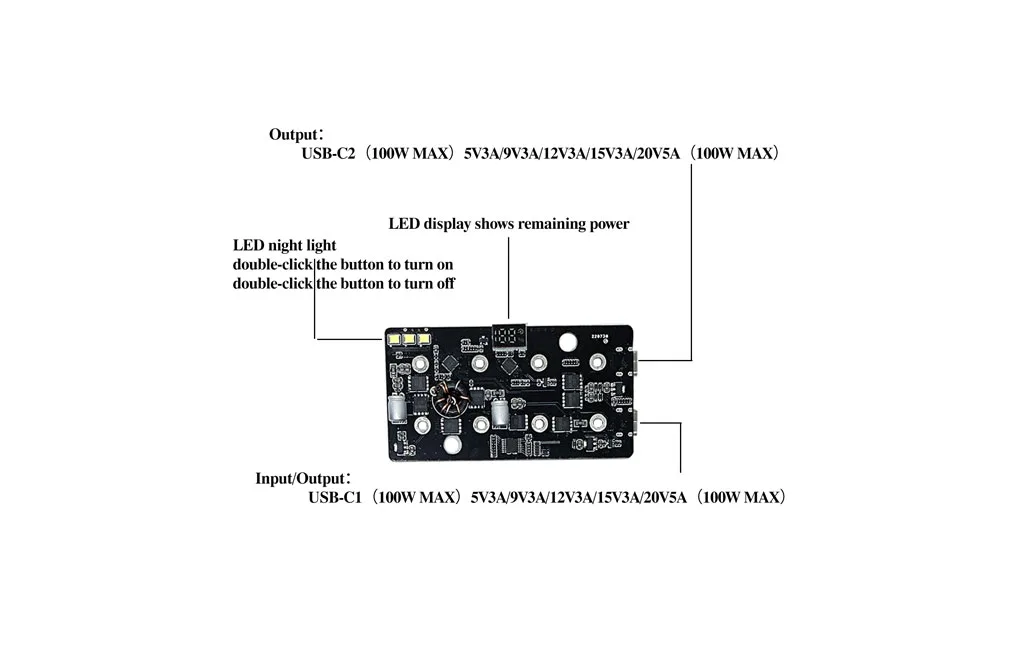 - 4.Function: A DIY power bank that supports charging of notebooks, tablets, and mobile phones, with 2 USB Type C ports, C1 port supports bidirectional input and output, maximum power PD100W (20V5A), C2 supports unidirectional output, maximum power 100W (20V5A).
